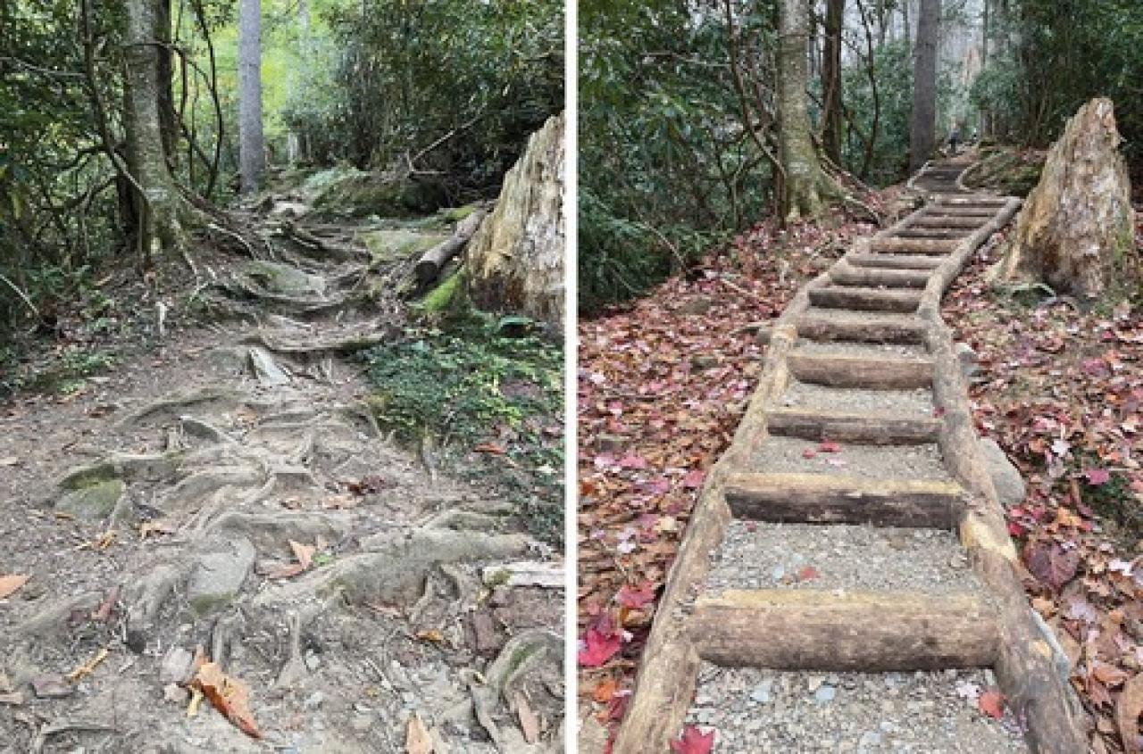A before-and-after image of a section of Ramsey Cascades trail, which was extensively rehabilitated in a years-long project that concluded this week. National Park Service